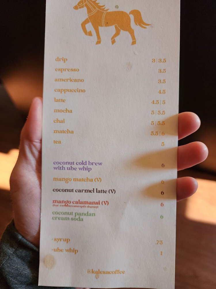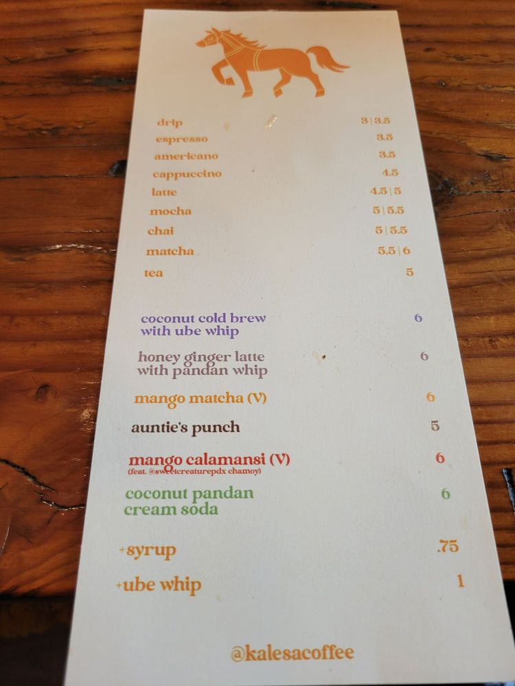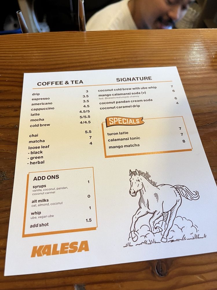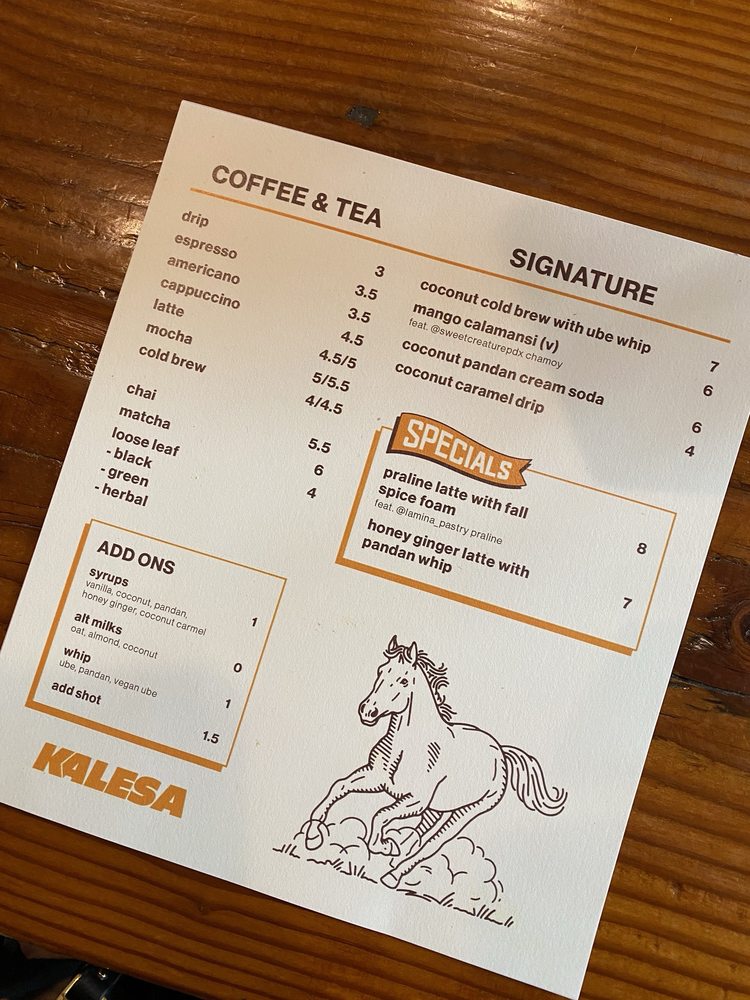 Welcome to Kalesa Coffee, a charming haven tucked away in Portland, specializing in rich flavors inspired by Filipino culture. Located at 722 N Page St, this delightful spot serves an impressive array of coffee and tea options, such as the creamy Matcha, robust Cold Brew, and inviting Lattes, with prices ranging from $3.50 to $5.50.